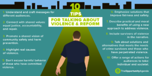 This advice is intended to help shape a larger story, or narrative, around violence, its causes, and the people involved and change hearts, minds, and policies around the issue.