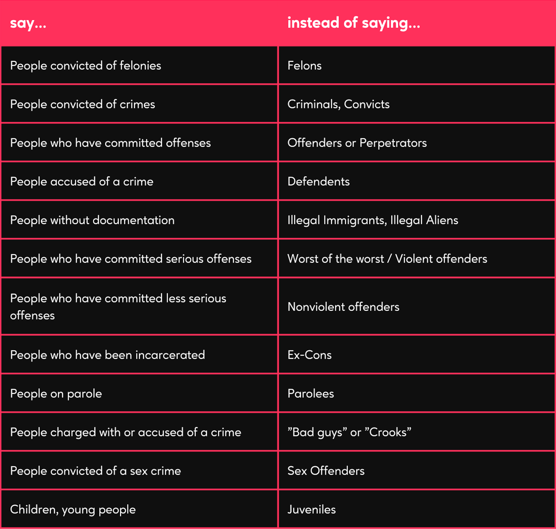This phrase guide provides helpful tips for talking about issues relating to the criminal system. However, there may be instances when you are talking with communities and individuals whose preferences differ from the advice in this guide. That’s okay. Respect people’s choices and voices. Not everyone in a group is the same. Although the language from this guide builds upon organizing, advocacy, and research arguing that humanizing people most impacted by the criminal system is a step toward making the system fairer, some people might have different language preferences in certain instances. The most important thing to recognize is that people impacted by the criminal system are people, and how we talk about them affects the public discourse, narratives, and policies that impact their everyday life.