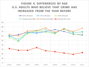 Belief that crime had increased “in the last year” dramatically declined in the 1990’s, from 71% in 1996 to 41% in 2001, running parallel with the decline in actual violent crime victimization rates (from 65% in 1996 to 33% in 2001) (Saad, 2013). However, shortly after September 11, 2001, opinion that crime was increasing quickly shot back up and remained above 50%, with a peak of 74% in 2009, despite continued decreasing crime rates. More recently, despite the setback in battling crime in the past two years, Americans are slightly more, rather than less, positive about the crime rate. Most interestingly, different demographic groups perceive the crime rate differently.