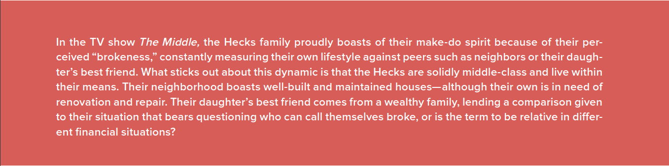 - Each television show avoids discussion of the precarious nature of meeting daily expenses—such as the ability to pay for utilities, phones, food, and other essentials—for those working with a low income.