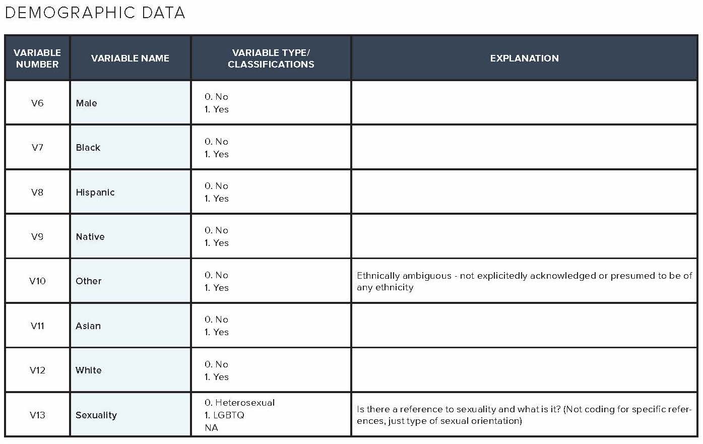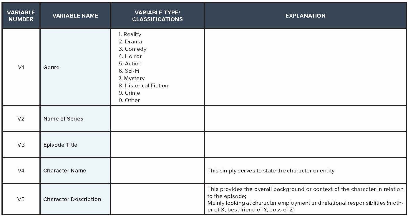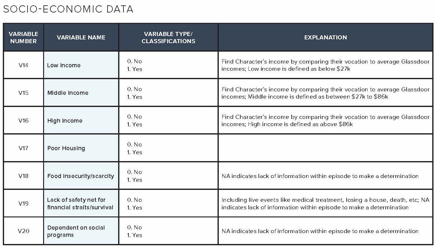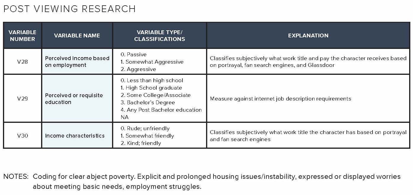 This code book is designed to assist in the process of coding and analyzing television shows for the portrayal of character income and lifestyle parallels. The media content analysis will analyze the content of 105 television episodes randomly sampled from 53 popular television series. Our content analysis will focus on the frequency of inclusion and trends in the representation of characters across perceived income. Our analysis will also focus on storylines associated with low-income characters and income disparity more broadly.