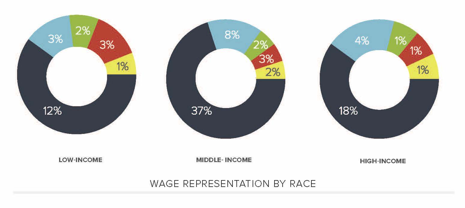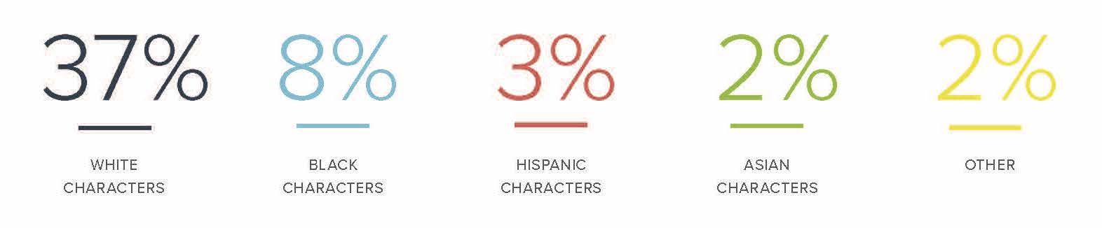 In the 2017–2018 season of television, character representation across race and ethnicity skews overwhelmingly white. This disproportionate sample means that each level of income holds double-digit percentage rates of white representation, whereas their BIPOC peers remain 8% or less in any income representation. The greatest distribution of income representation by race/ethnicity occurs at the middle-income tier—with white characters making up 37%, Black characters 8%, Hispanic 3%, and Asian and Other at 2% each. This is unsurprising, given the wide range of income this designation covers.
