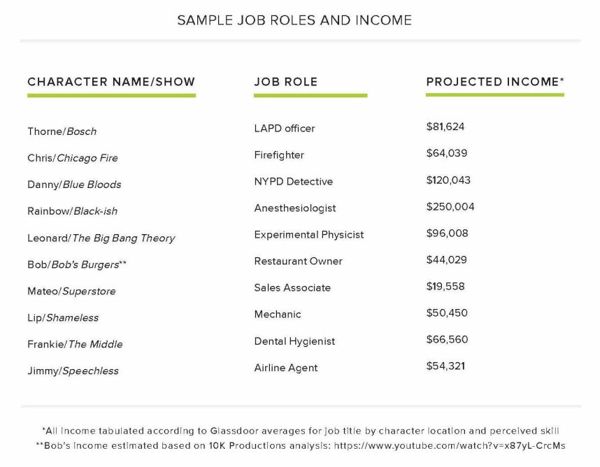 The spread of income presented in the table must be further scrutinized by the number of people in each household who also generate income as well as cost of living per locality. What we overwhelmingly found is that those with higher salaries tended to live in households with partners who generate similar income or on their own, leaving them free to afford cost of living in the cities they inhabit. For example, Rainbow Johnson from Black-ish not only generates high income as a physician, but she also is also married to a senior advertisement executive who helps their family of five children, two retired grandparents, and two working adults to pay for college, private school, and a lifestyle befitting the suburbs of Los Angeles. This representation is in direct juxtaposition to the DiMeo family in Speechless, who get by on the single income of the father, Jimmy DiMeo, and any disability aid that supports one of the three kids, JJ, who has cerebral palsy.