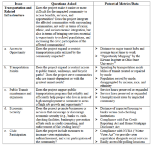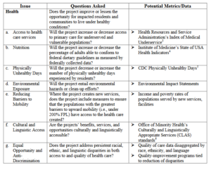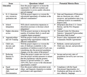 The data necessary to measure equity and the expansion of opportunity in a specific project will frequently be available from existing sources. After identifying the relevant geographic area, agencies can draw first from existing federal, state, and municipal data, including Census data, to determine likely impact.1 Important equity issues, the relevant questions that agencies should be asking about how ARRA projects impact those issues, and potential metrics and data sources to answer those questions are suggested below for five areas: 1) Economic Development (including any job creation across all sectors); 2) Health; 3) Education; 4) Housing; and 5) Transportation and Related Infrastructure.2