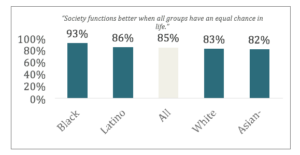 Just like behavioral versus societal explanations for inequality, views on linked fate predict policy preferences and the intention to take action on inequality, as well as attitudes about discrimination more generally. Those who are more inclined to see prosperity as linked are more likely to view unequal treatment of groups as a serious problem, to support the opportunity-‐expanding solutions tested, and to express greater willingness to take action on opportunity issues. Elevating an understanding of linked fate, therefore, may move more people towards support for social justice issues and action. Additionally, emphasizing societal explanations for inequality, rather than perceived “deservingness,” will likely help combat the belief that some groups in society deserve to be treated better (or worse) and afforded more opportunities than others.