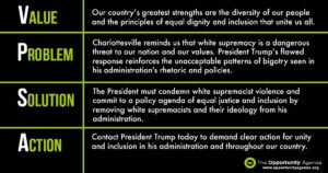 The President must not only condemn white supremacy, bigotry, and violence, but also rid his administration of supremacists and their ideology, and commit to a policy agenda of equal justice and inclusion.