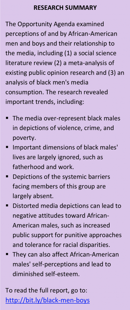 A large body of research (discussed later in this memo) finds a persistent trend of distorted media depictions of Black men and boys that contributes to negative stereotypes, inequitable treatment, and unequal opportunity in areas ranging from employment, to education, to policing and sentencing.